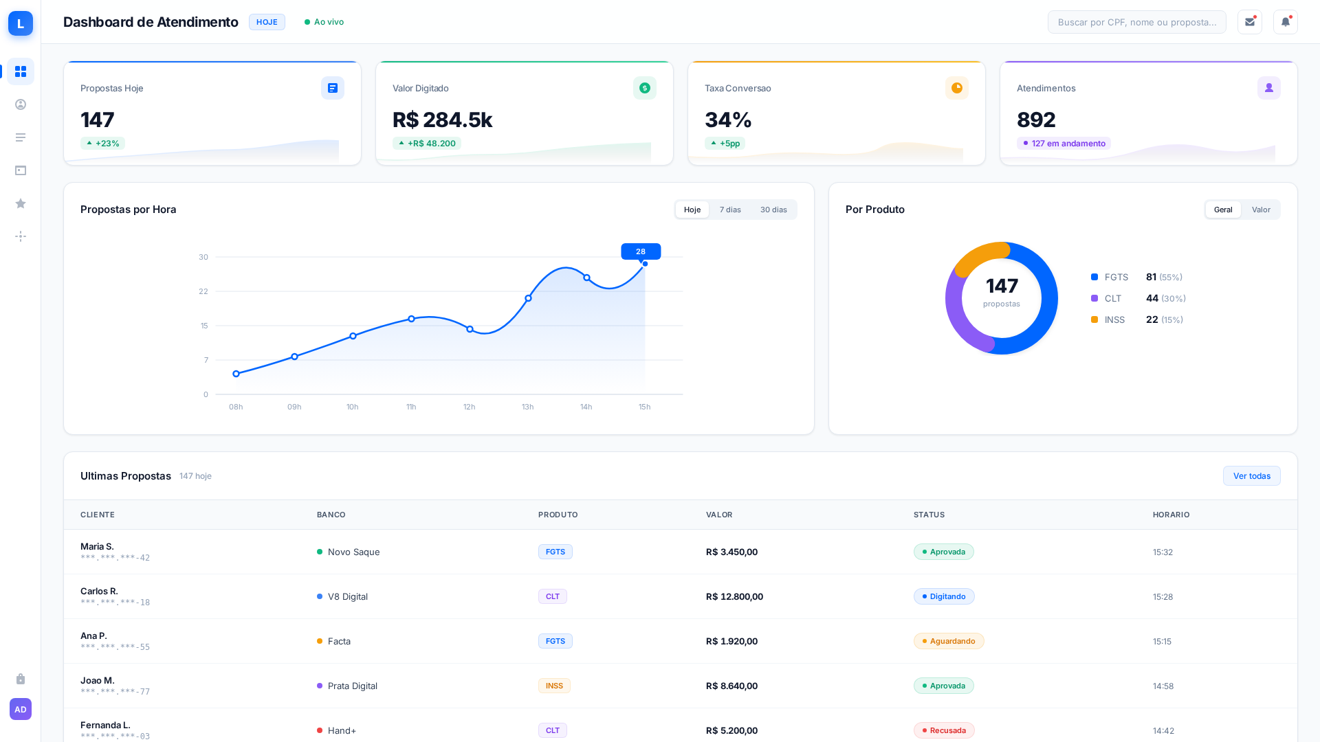 Visualize todas as propostas em tabela com filtros por banco, status, período e convênio. Sincronização em tempo real, redigitação em lote e importação massiva.